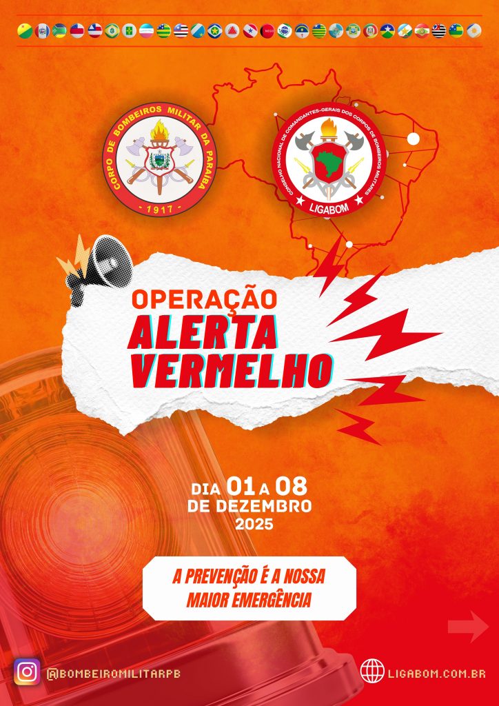 O Corpo de Bombeiros Militar da Paraíba (CBMPB) realiza, no período de 1º a 8 de dezembro, a “Operação Alerta Vermelho 2025”, mobilização nacional coordenada pela LIGABOM que envolve os 27 Corpos de Bombeiros Militares do Brasil. A iniciativa é alusiva à semana comemorativa ao nascimento do Imperador Dom Pedro II, Patrono dos Corpos de Bombeiros Militares do país, e tem como foco o fortalecimento das ações de prevenção, educação em segurança e fiscalização em benefício da sociedade paraibana.