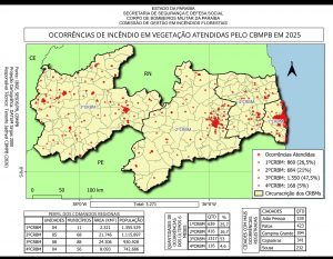 A distribuição das ocorrências por Comandos Regionais revela que o 3º CRBM, responsável pelo Sertão paraibano, concentrou o maior volume de atendimentos em 2025, com 1.550 ocorrências (47,5%). Em seguida, estão o 1º CRBM, no Litoral (869 registros – 26,5%); o 2º CRBM, na Borborema (684 ocorrências – 21%); e o 4º CRBM, no Agreste (168 atendimentos – 05%). Apesar da predominância no Sertão, o estado apresenta redução geral, com expectativa de queda ainda mais acentuada à medida que as chuvas se intensifiquem.