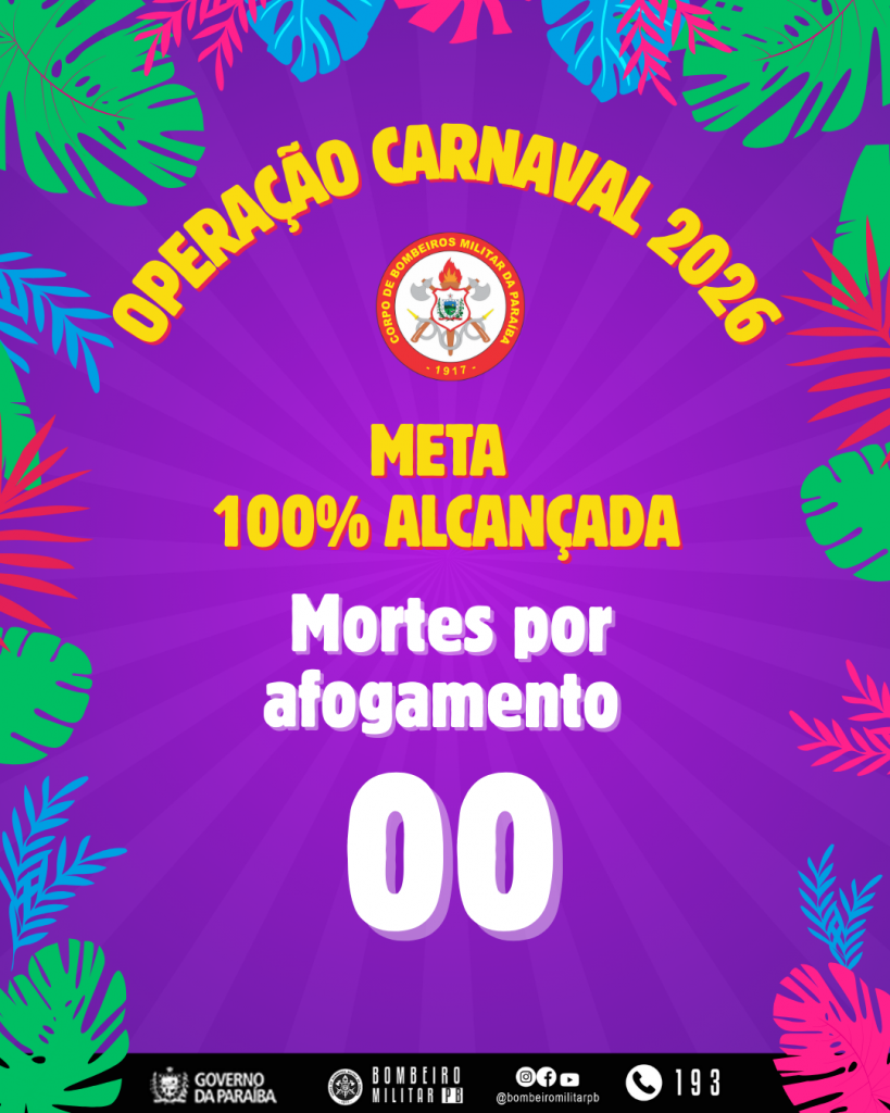 O Corpo de Bombeiros Militar da Paraíba (CBMPB) concluiu, no final da tarde dessa terça-feira (17), a Operação Carnaval 2026 com o registro de zero mortes por afogamento nas áreas de prevenção aquática sob responsabilidade da Corporação. O resultado evidencia o fortalecimento das estratégias de prevenção, monitoramento e pronta resposta empregadas ao longo do período carnavalesco.