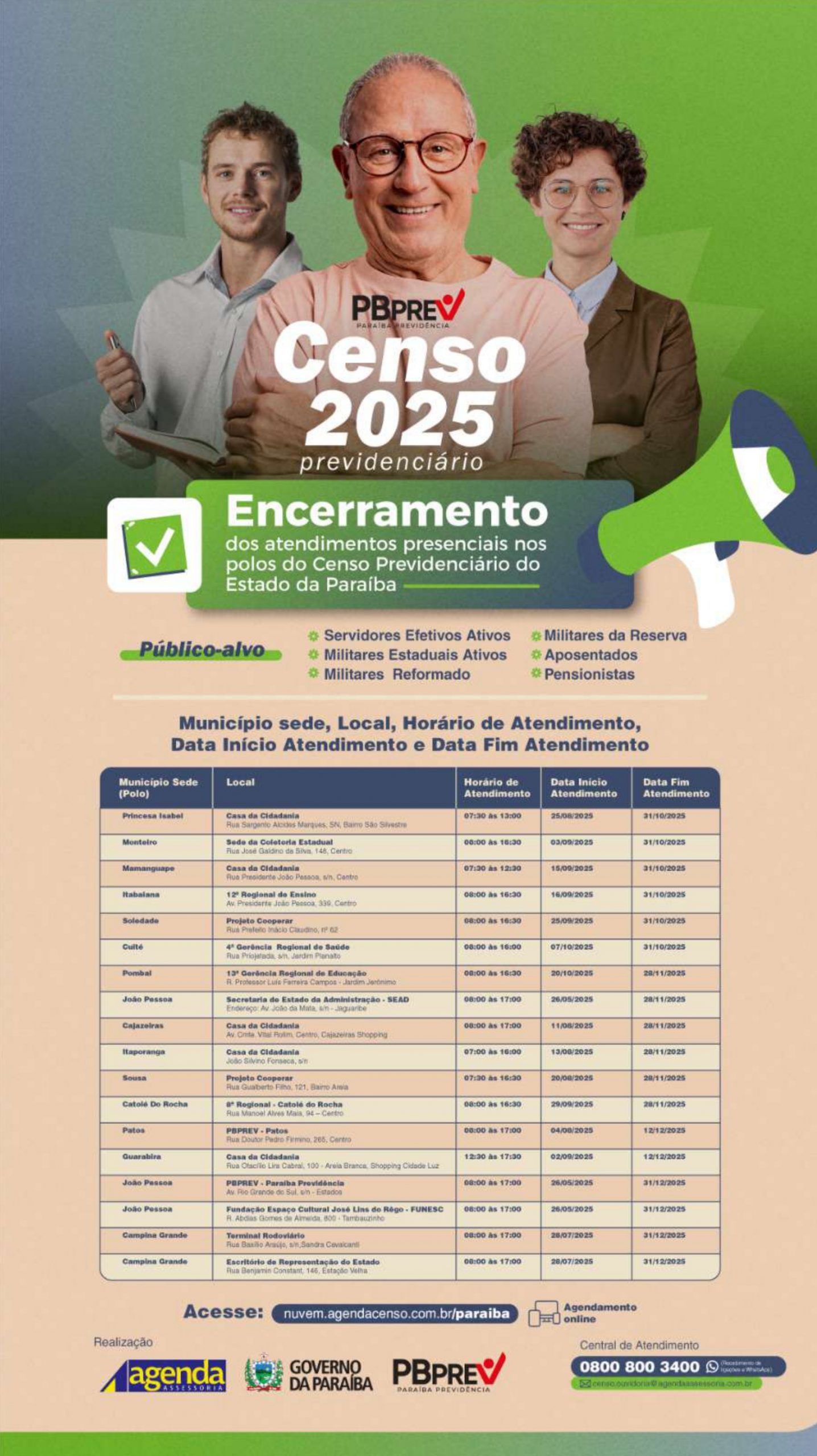 O agendamento é obrigatório e deve ser feito de forma rápida pelo link: https://nuvem.agendacenso.com.br/paraiba/. A atualização evita inconsistências em registros funcionais e previdenciários, assegurando a correta vinculação dos dados e a continuidade dos serviços.